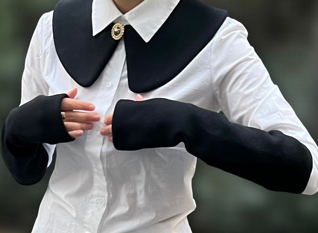 Les mitaines et le col assorti sont confectionnés dans une laine noire profonde et douce. Le noir intense élance les mains et encadre délicatement le cou, créant un ensemble à la fois minimaliste et très sophistiqué.