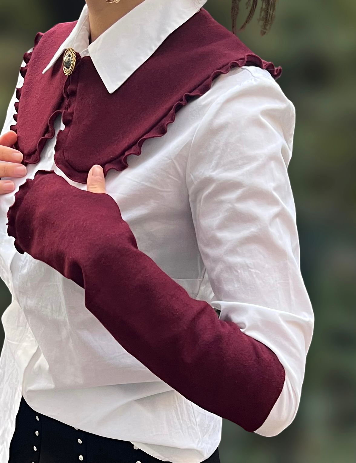 Le bordeaux profond offre une intensité riche et noble. Les mitaines et le col assorti enveloppent de chaleur tout en apportant une touche de couleur élégante et subtile. Le col, légèrement structuré, met en valeur le port de tête, tandis que les mitaines prolongent cette sophistication sur les mains.