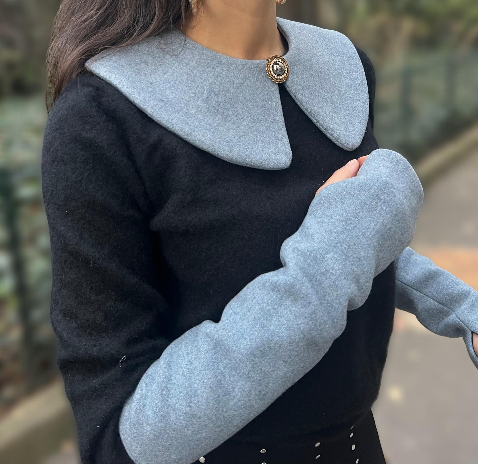La laine gris glacé offre un aspect lumineux, presque argenté, qui donne un charme doux et sophistiqué à l'ensemble.